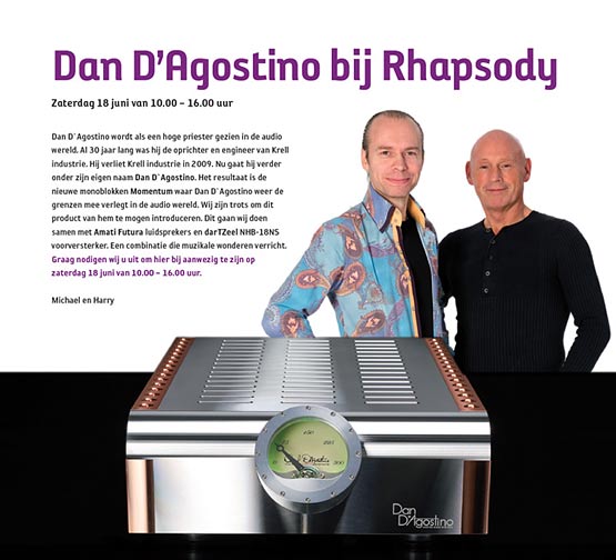 Rhapsody Sound + Vision in Hilversum zal zaterdag 18 juni van 10.00 ’s-morgens tot 16.00 ’s-middags een speciale show organiseren rondom de Dan D’Agostino Momentum versterker samen met Sonus faber Amati futura luidsprekers en darTZeel NHB-18NS voorversterker.