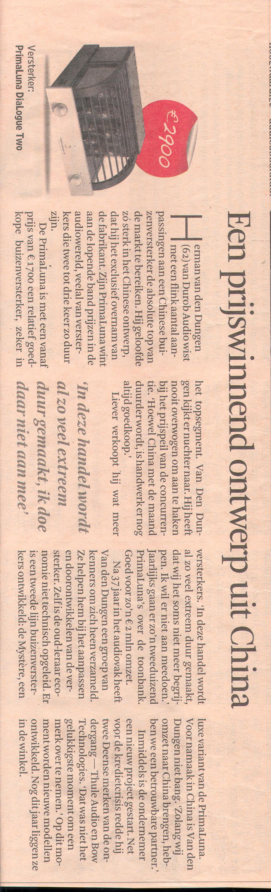La semaine dernière une page entière du Financial Dagblad a été consacré au fait que le sol hollandais est propice à l’exportation de produits audio exclusifs. Nous pensons nous situer au tout début de ce que nous pourrions apporter au marché, aussi gardez les yeux et les oreilles ouverts sur nos activités en 2012.