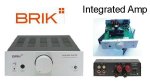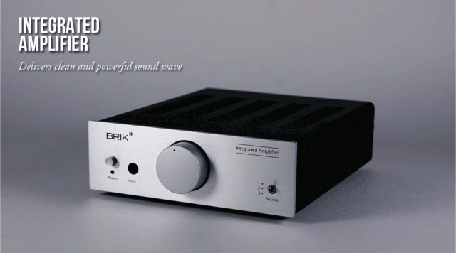 “The integrated amp from Brik is a standard desktop integrated amp. It comes with a AC adapter type power pack and in silver face like the rest of the Brik range, and in the same size, so you can stack them all up in a neat little stack. It has 2 sets of RCA inputs on the back, and a 3.5mm input on the front… which I am assuming is for plugging in ipods and stuff”.