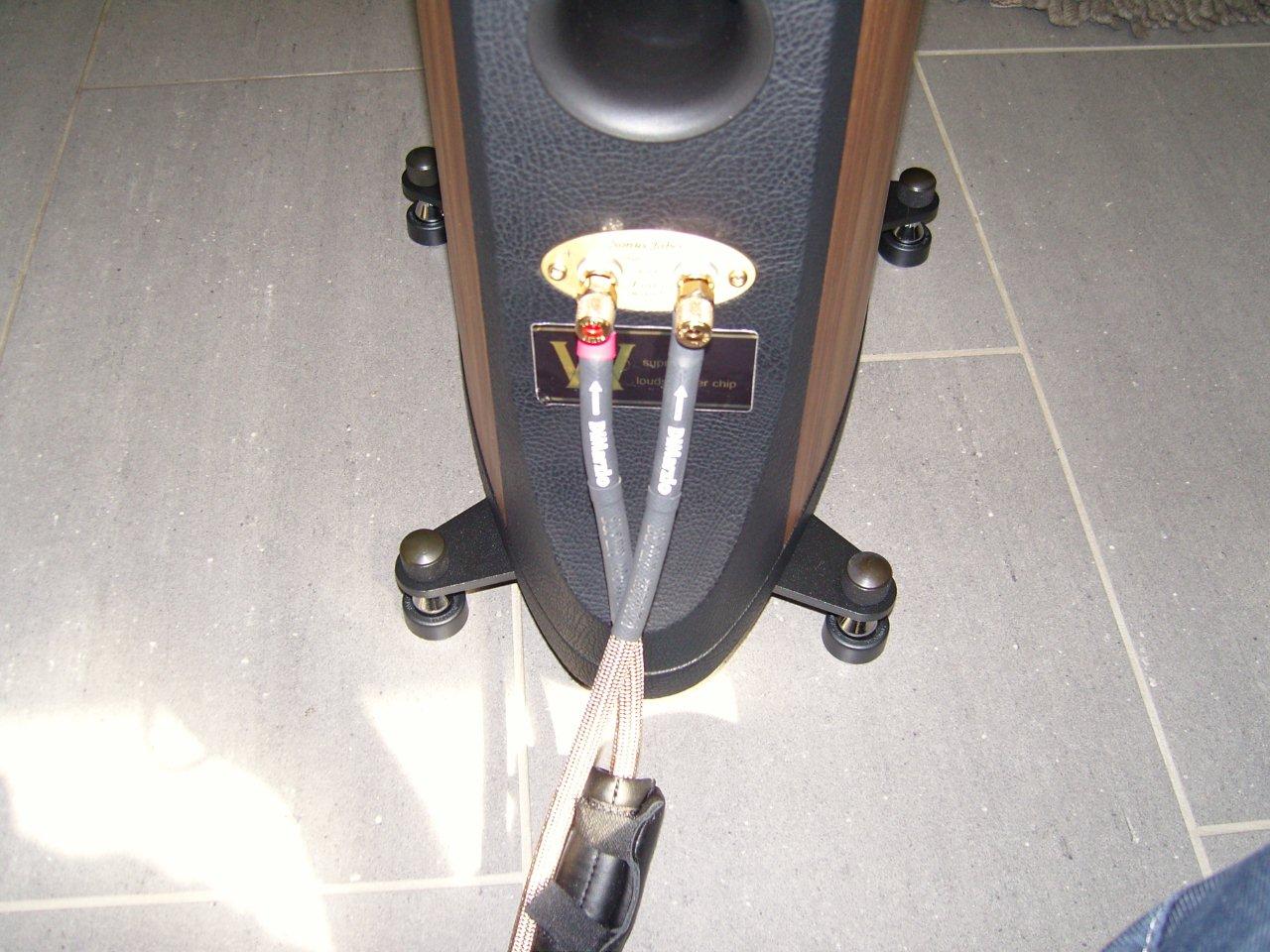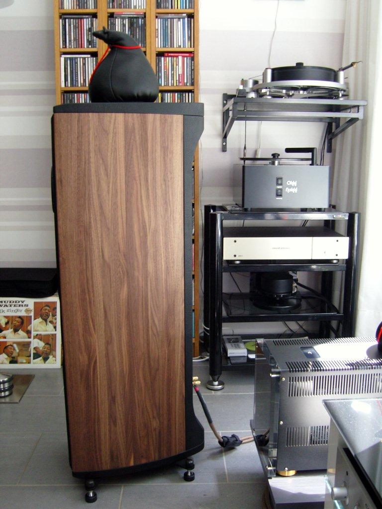 “Richard en zijn bus werden door Rob ingeschakeld om de luidsprekers een maand of 3 geleden niet bij Rob, maar meteen keurig bij mij thuis af te leveren/ uit te pakken en de voet etc. te monteren, iets wat hij erg goed en met passie doet. Wel heb ik direct de bijgeleverde Spikes vervangen door 2 sets SOUNDCARE Superspikes, eigenlijk een spike die direct weer in een demper rust. Niet alleen erg fraai om te zien, maar het werkt ook beter met als gevolg een strakker laag en de speakers zijn dan trouwens ook makkelijker te verschuiven om tot een gewenste plaatsing te komen. Een aanrader, ook bij andere merken en types of onder in de voet van een monitorsysteem! De speakers moeten het in mijn set thuis onder andere doen op een Copland CTA 301 MK2 gemodificeerde buizen voorversterker, een Audio Flight Two cd speler, Electrocompaniet AW 180 mono’s, Mitchell Gyro platenspeler en Conrad Johnson EV1 phono trap. Ten behoeve van de schone stroomaanvoer gebruik ik diverse merken. Met bekabeling variërend van Transparent tot Furutech, Dimarzio, Oyaide en diverse zelfbouwkabels waar ik momenteel mee bezig ben.”