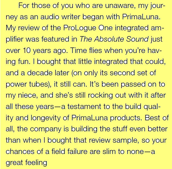 However, his story doesn’t end there. Motivated by the ProLogue’s success and armed with a long-term vision, van den Dungen and PrimaLuna have released four more series: Dialogue, ProLogue Premium, Dialogue Premium and DiaLogue Premium HP. Each represents a slight step up and are loaded with technological advances found on competitors’ products costing three to five times as much, or often not found at all on competitors’ products. Each series in the PrimaLuna line has captured critical acclaim across the globe and have received more than 150 awards; among them a Stereophile Class A rating and numerous Product of the Year honors.